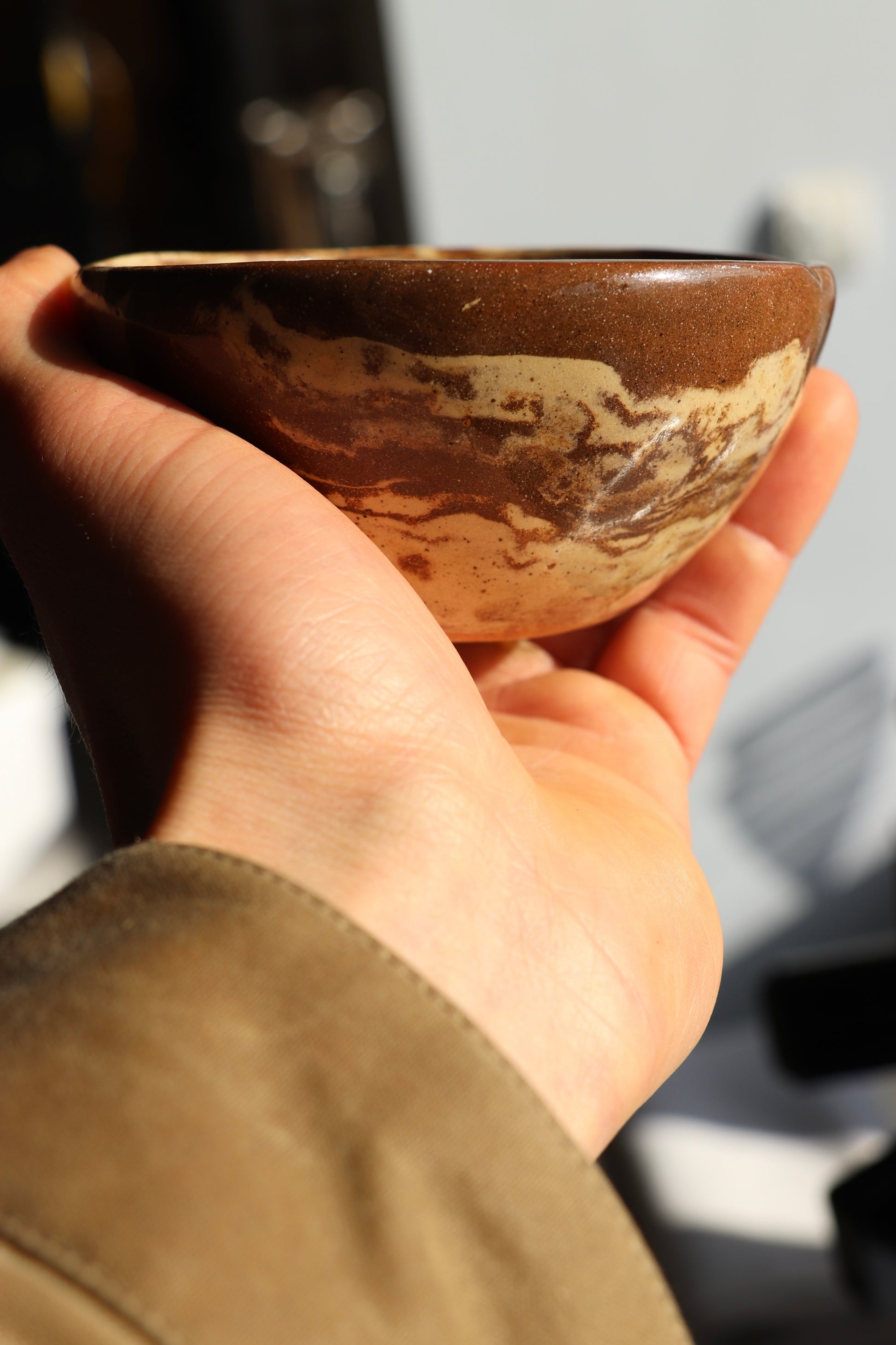 Look into its curves and lose yourself. The cup's lips are bold and soft, uneven and human. Hold in your hands an object from nature, shaped like pebbles softened by the seasons.